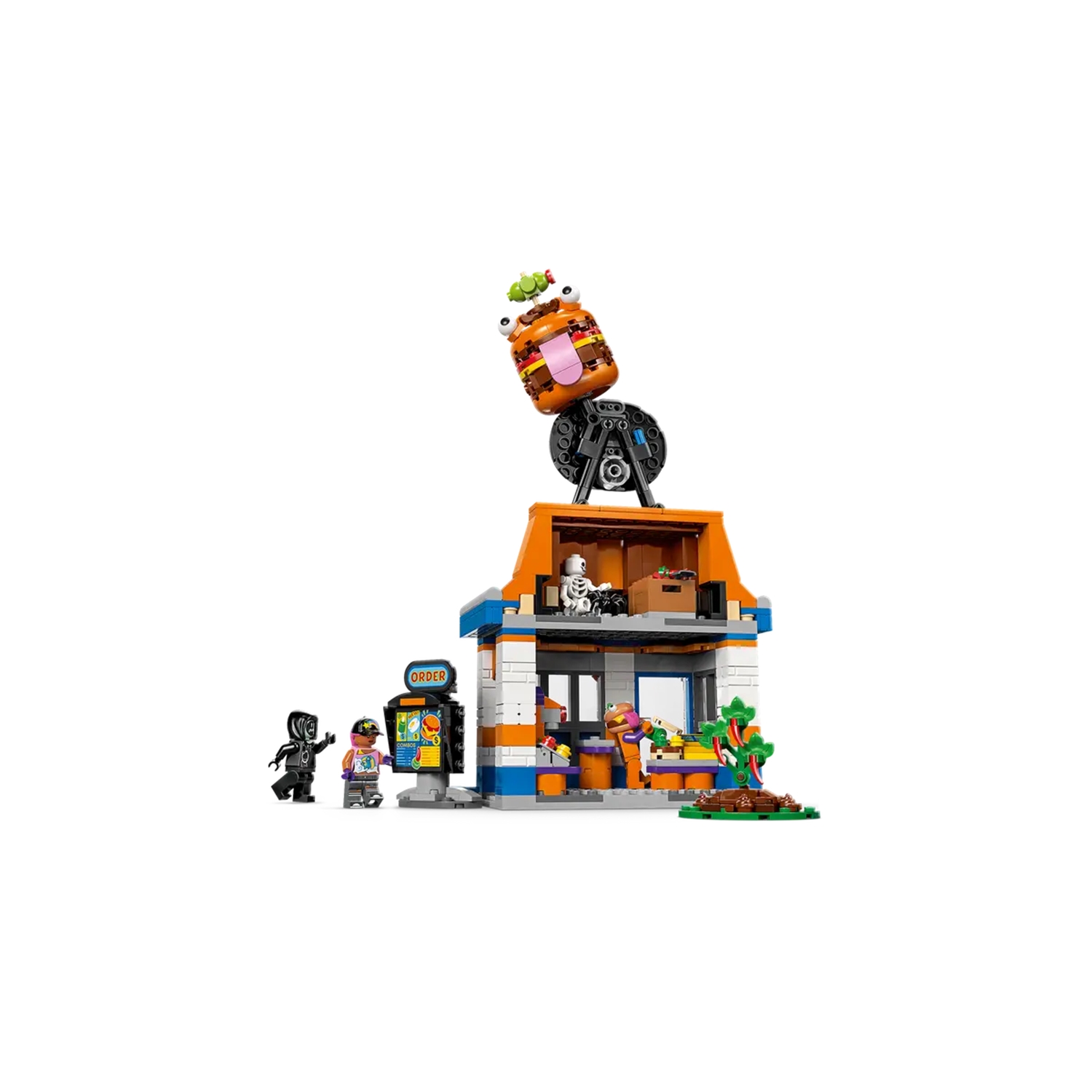 Gamer werden große Freude daran haben, das Modell des Durrr Burger Restaurants zusammenzubauen. Der modulare Aufbau erleichtert eine ganz individuelle Gestaltung. Neben einer Gewürzstation können Kinder auch einen Getränkeautomaten und eine Kasse entdecken. Draußen befindet sich ein Sitzbereich mit einer Tasse und einem Spiegelei. Im abnehmbaren Dachboden mit Platz für weiteres Zubehör wie eine Schaufel und Dynamit lauert eine Spinne. Die Minifiguren Strandbomber, Beefboss, Schmierfink und ein Skelett erwecken den Actionspaß zum Leben und laden zu fantasievollen Rollenspielen ein.
